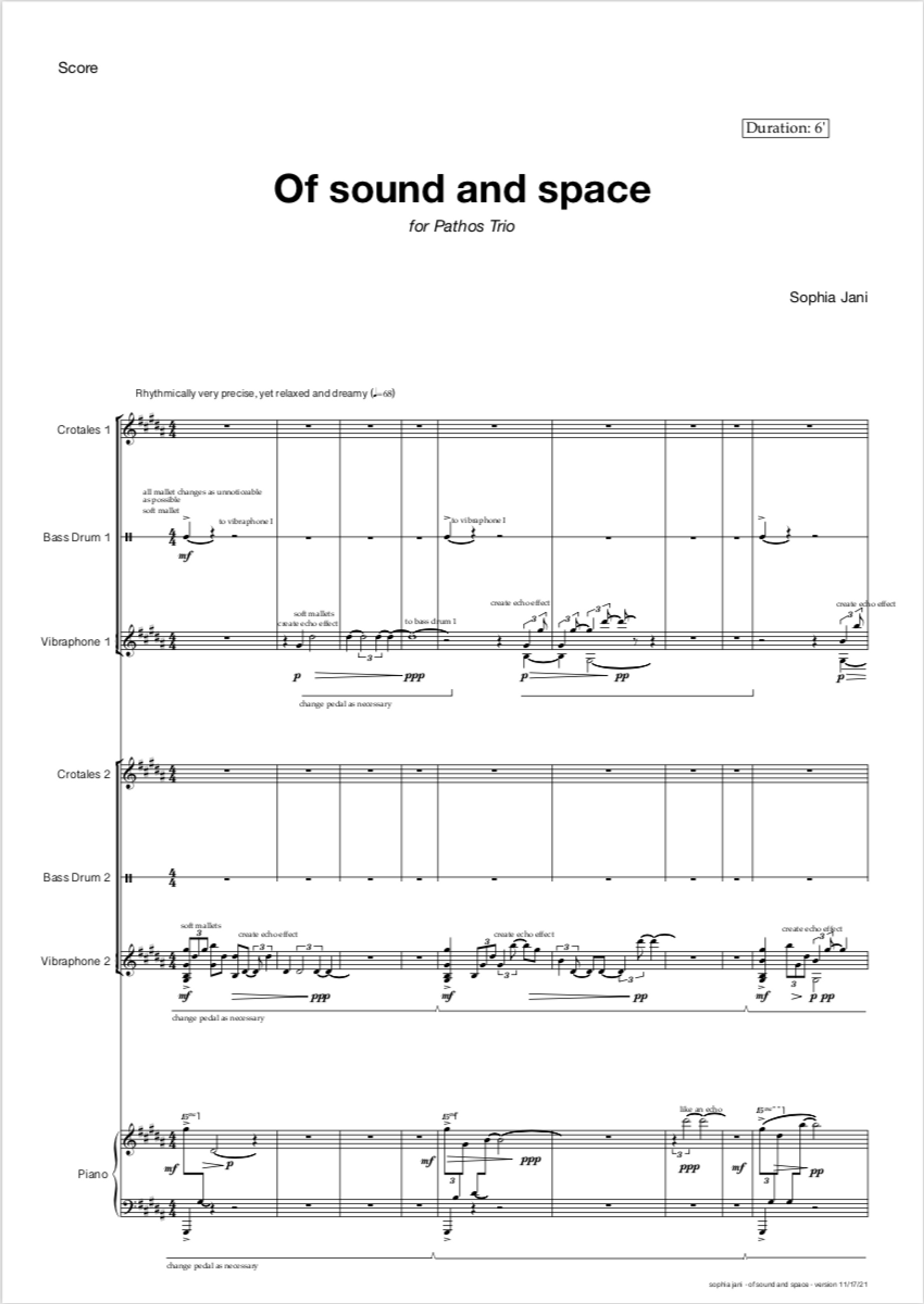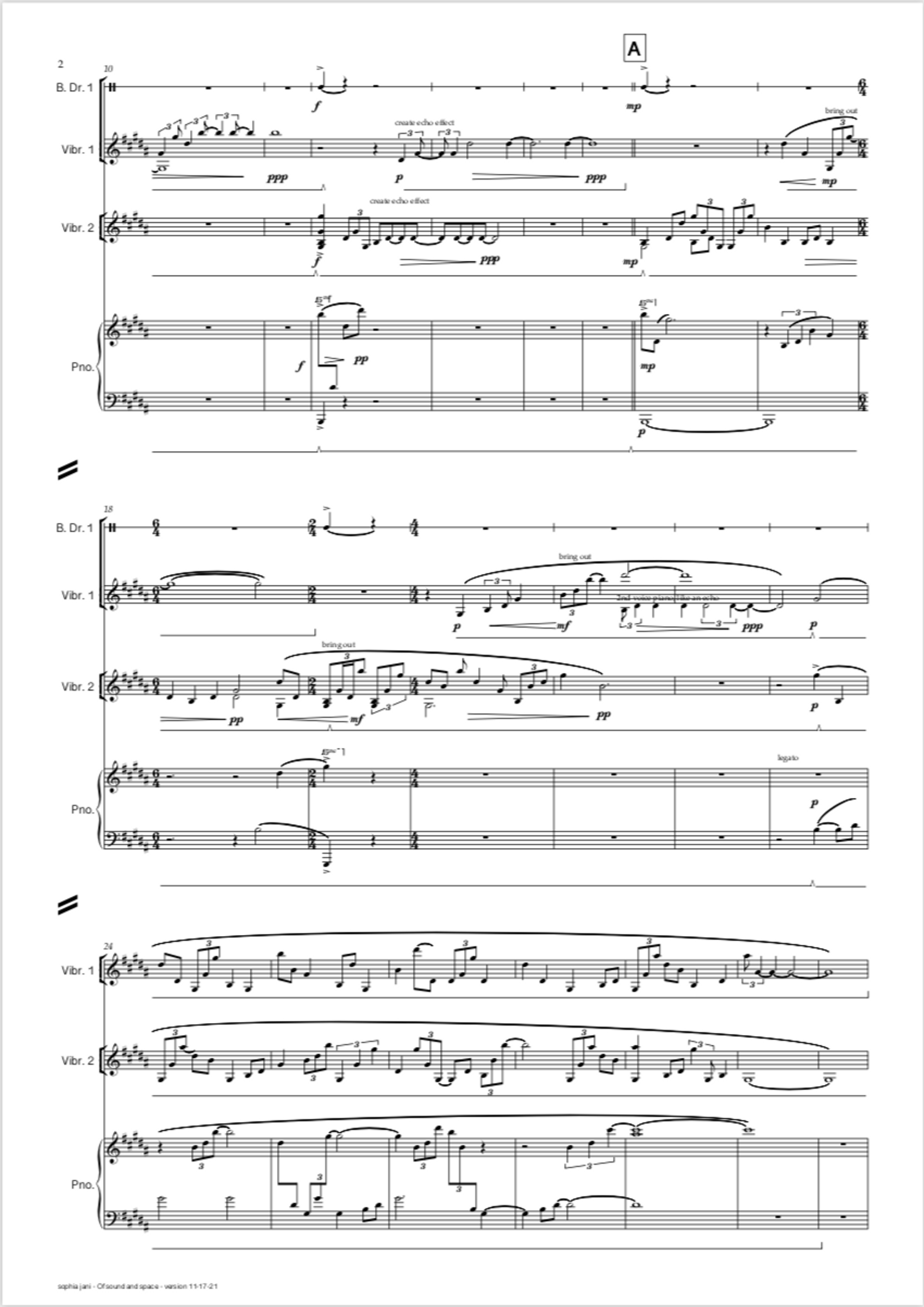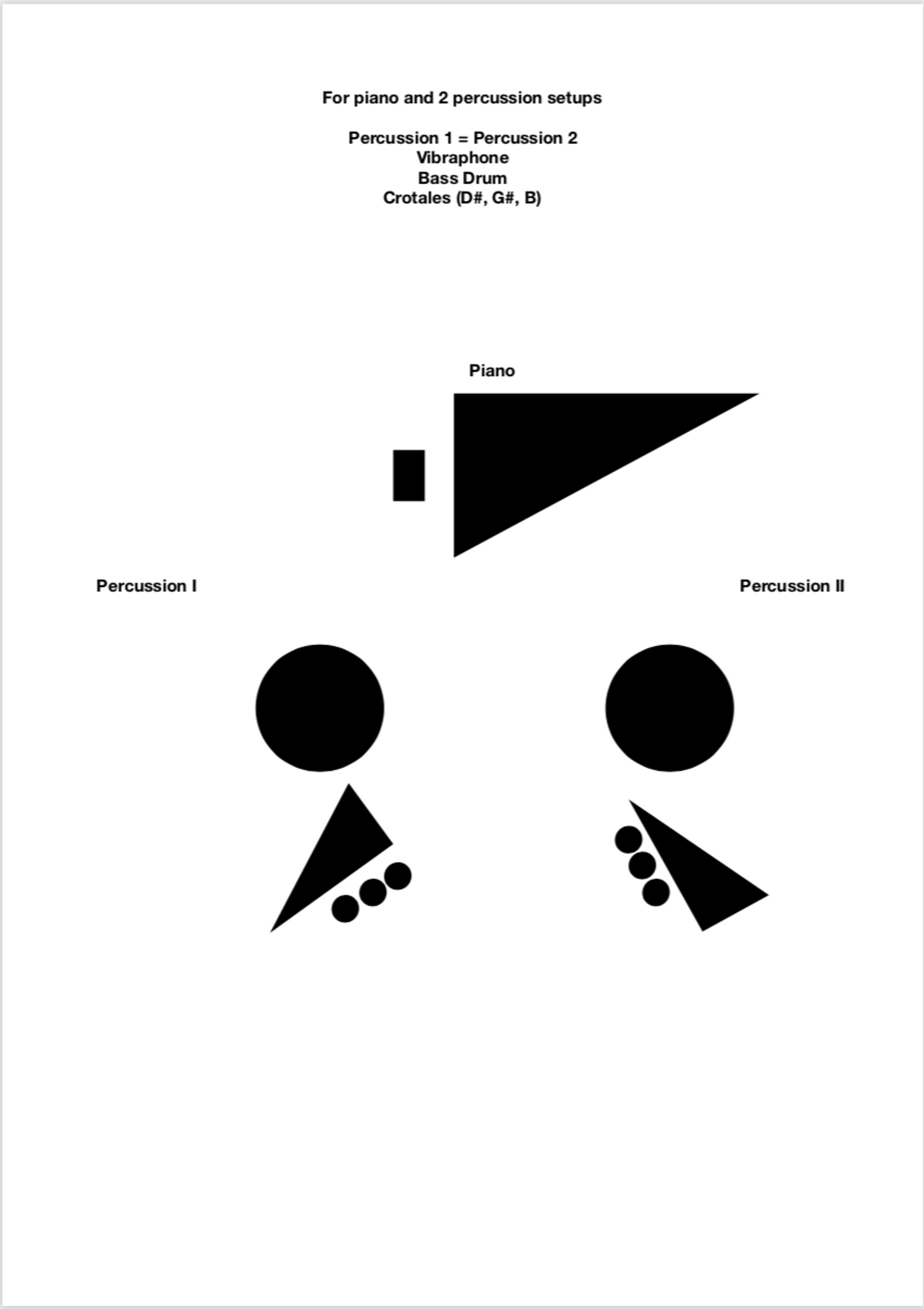 6:00 min"Of sound and space" explores how parameters such as dynamics, attack, sustain, and placement in the room can be used as main drivers in the development of a piece. The symmetrical juxtaposition of the two identical drum setups allows for the distribution of the same or similar elements in space, often emanating from the centrally placed piano. The bass drum often serves as a trigger element, turning on or off the dreamlike sway of the piano and vibraphones. To me it was interesting to observe how harmony and melody lose importance as form-giving parameters and, through their freedom, convey a dreamlike state whose development and form are shaped solely by the aforementioned parameters.