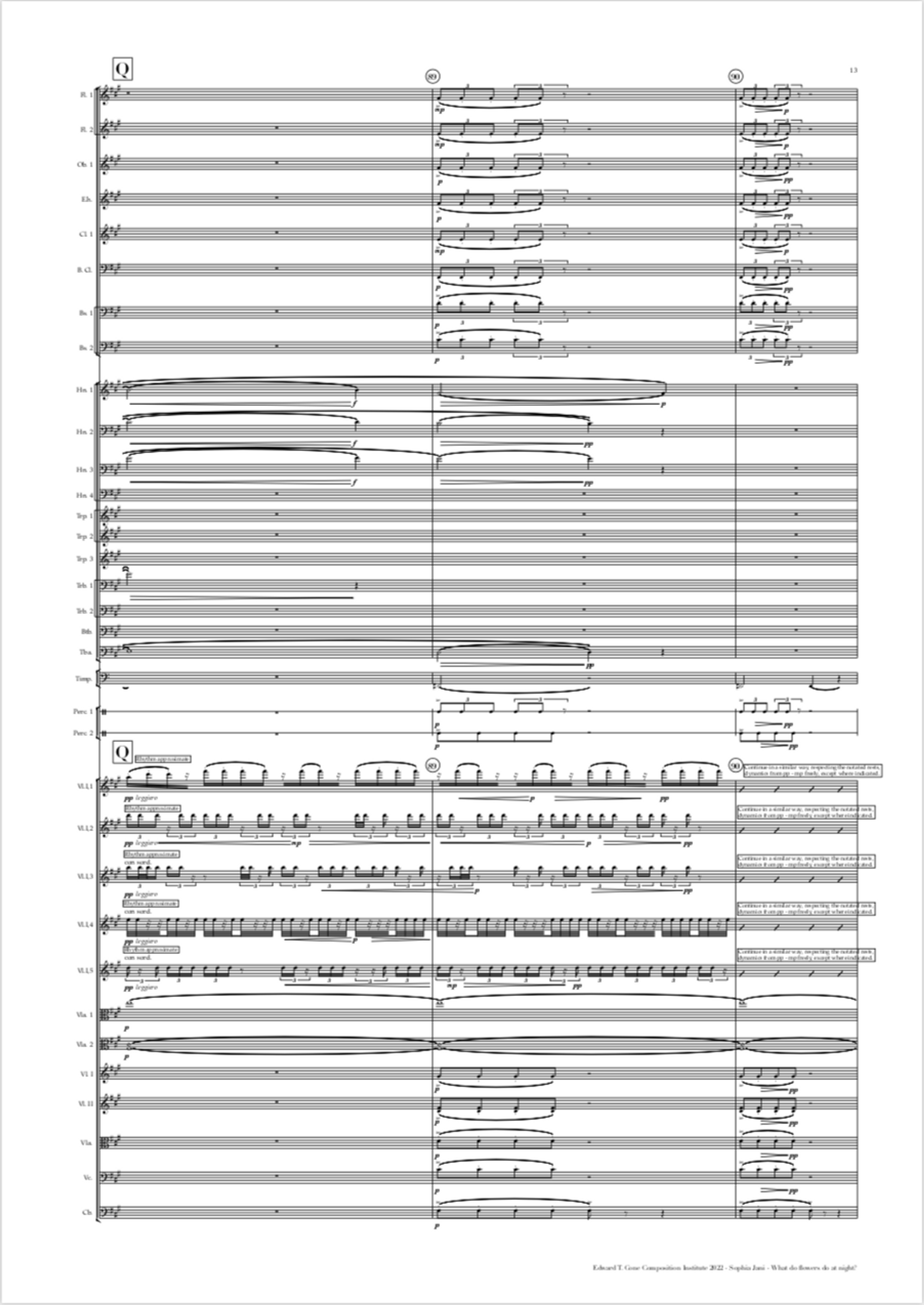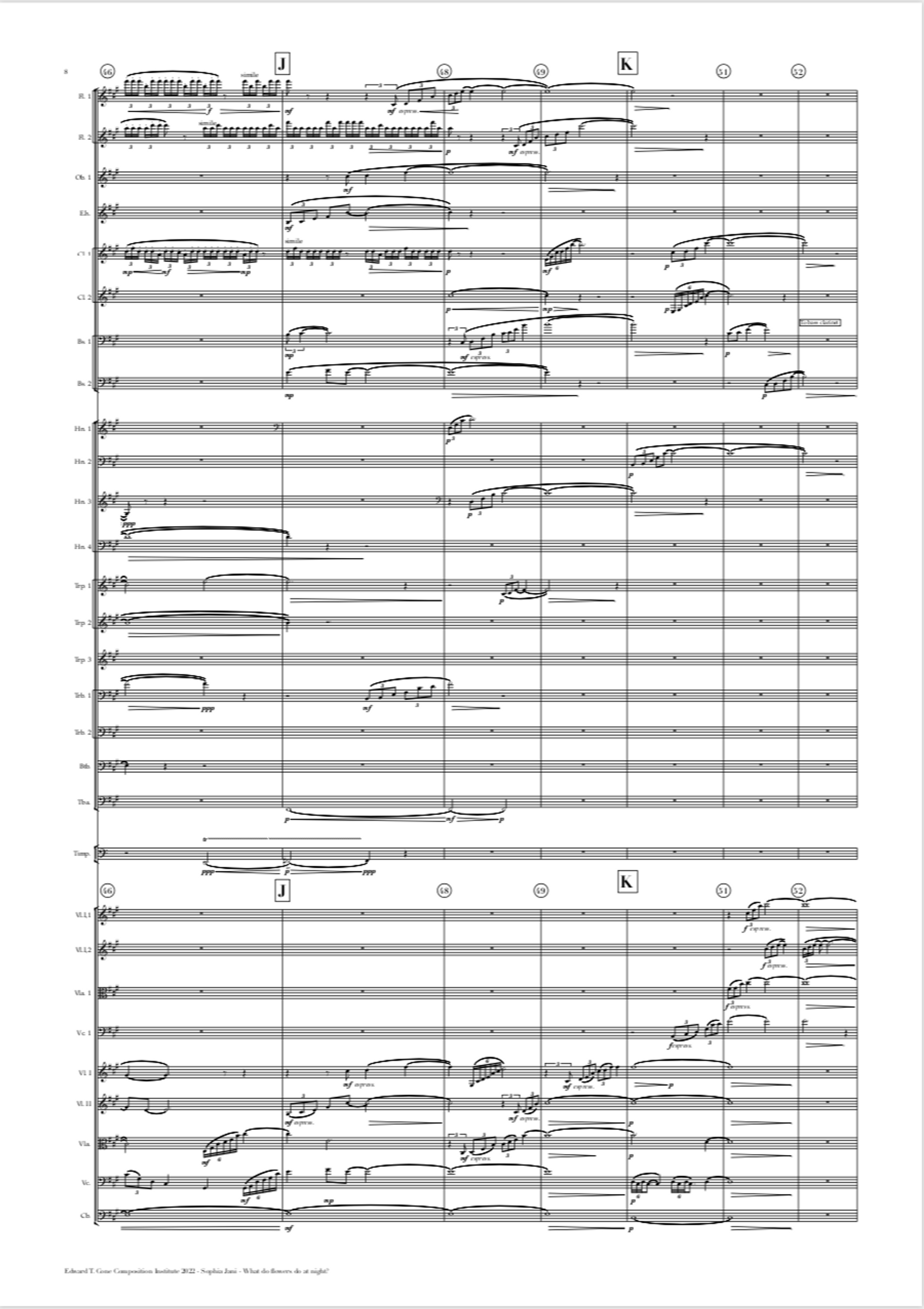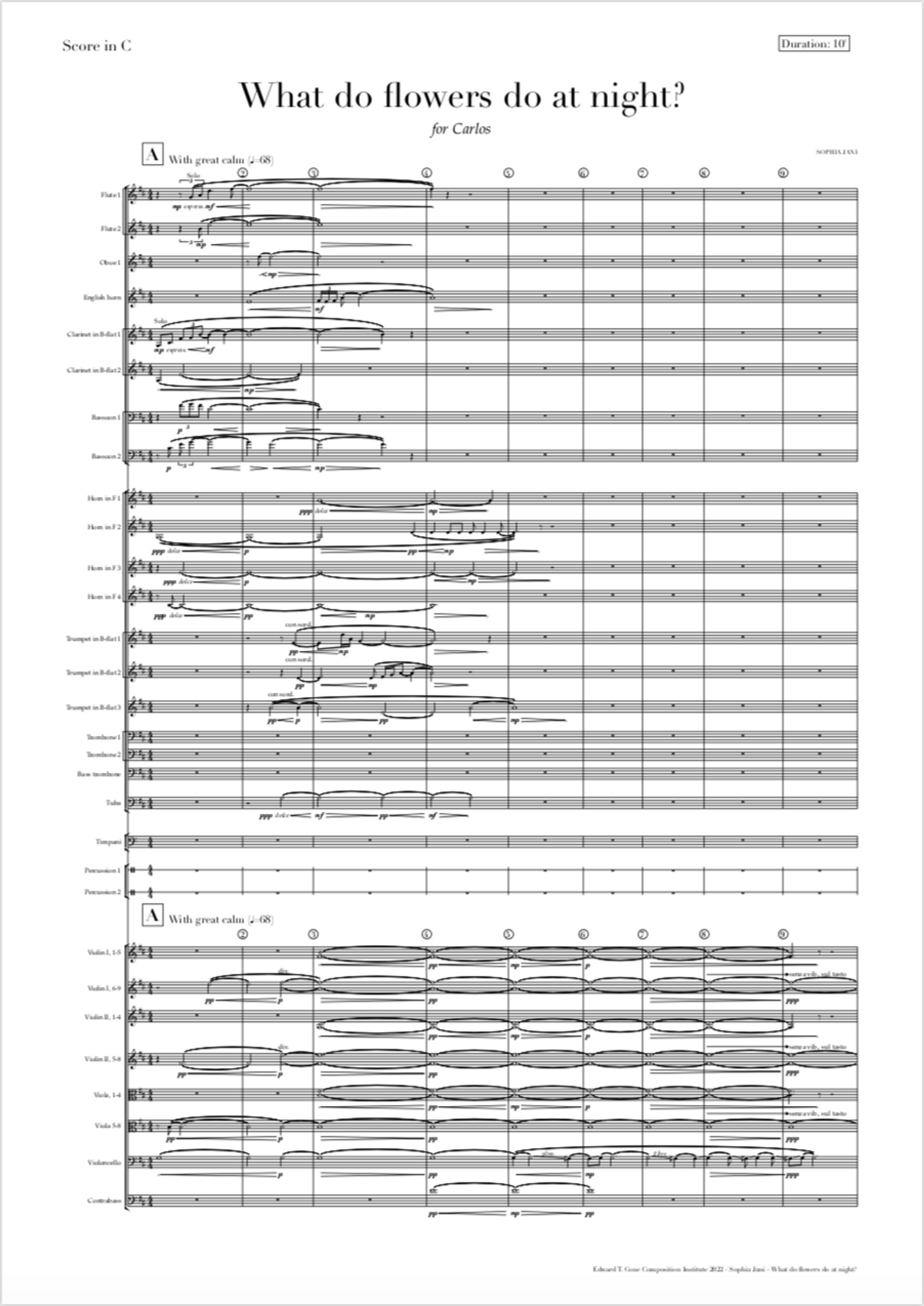 10:00 min"What do flowers do at night?" was inspired by a plant called Selenicereus grandiflorus - a cactus species that blooms in a beautiful way, but only once a year for one night. The charged, mysterious mood that comes with the anticipation of a unique event served as the starting point and form-giver for this work, and the beauty and elegance of the blossom, seemingly created so effortlessly by nature, served as an inspiration for me in crafting my composition.